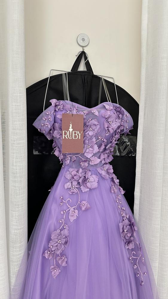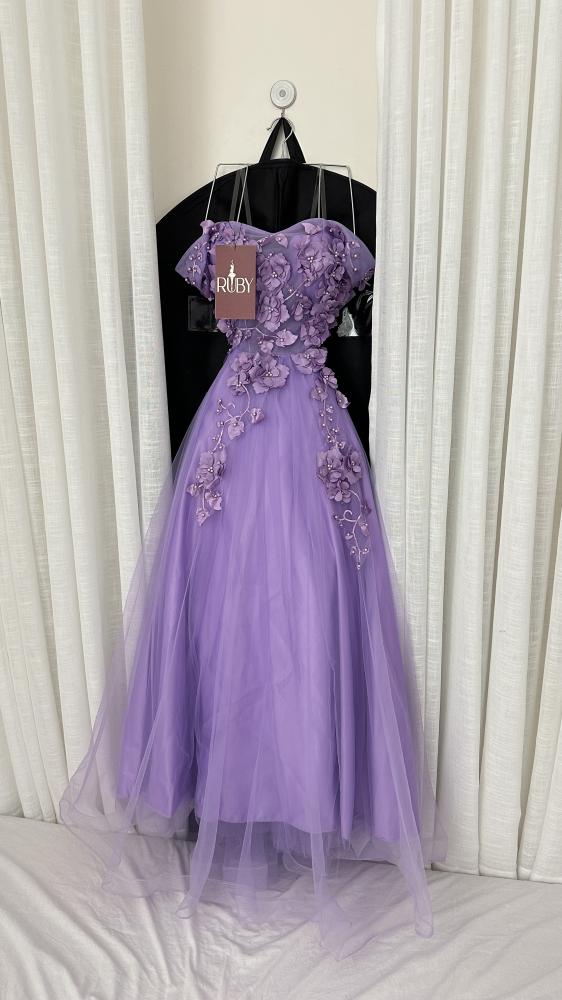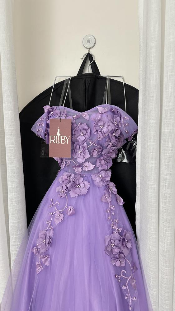 - فستان سهرة طويل، يبدو أنه منفوش أو واسع من الأسفل، مع جزء علوي مزين بتطريزات ثلاثية الأبعاد على شكل أزهار بنفسجية متناسقة مع لون الفستان.