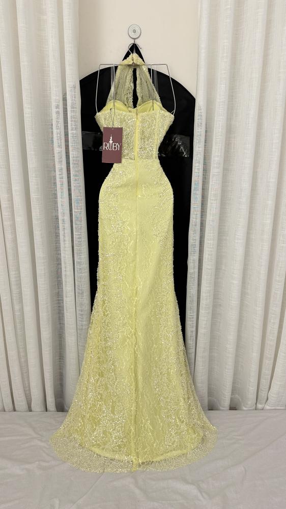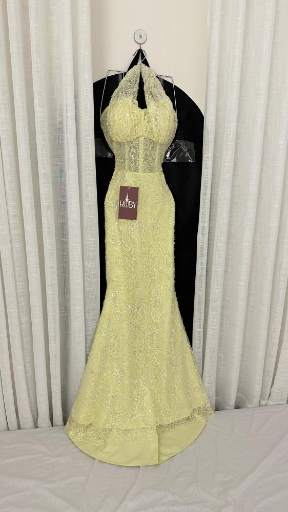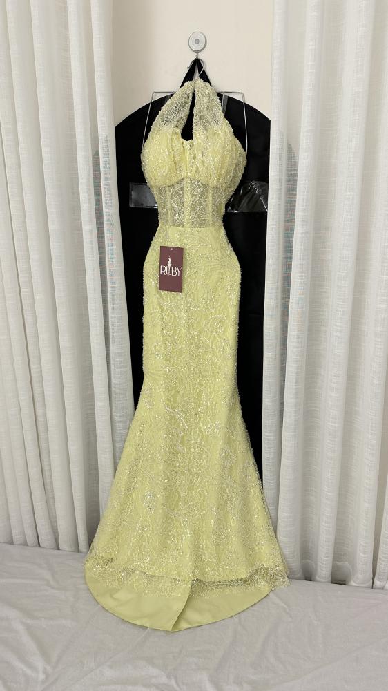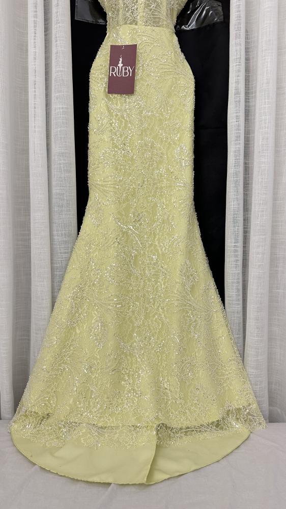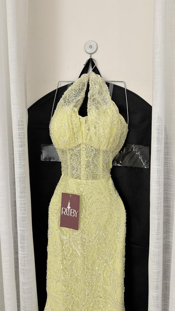 فستان سهرة طويل بلون أصفر فاتح (ليموني) من قماش الدانتيل و التل المطرز بالكامل.