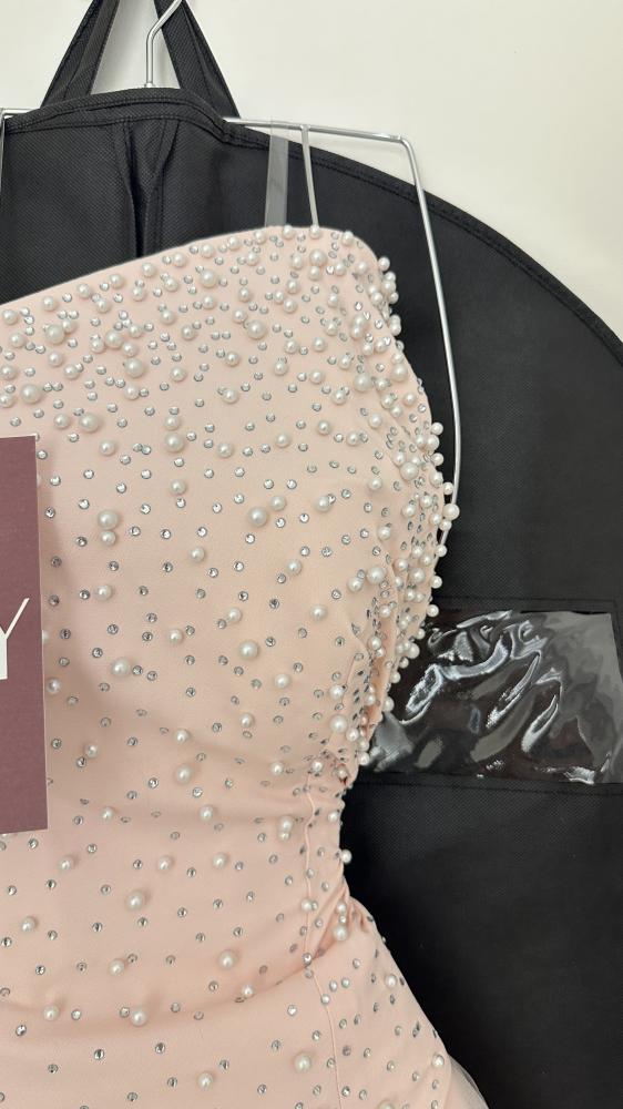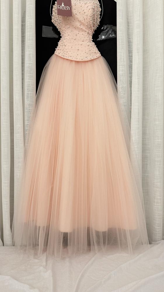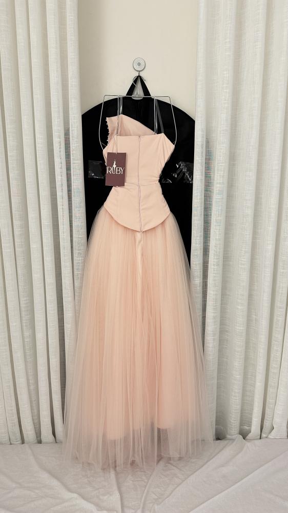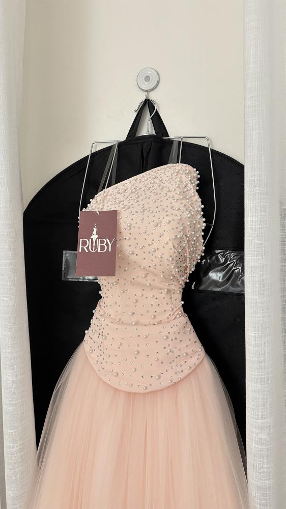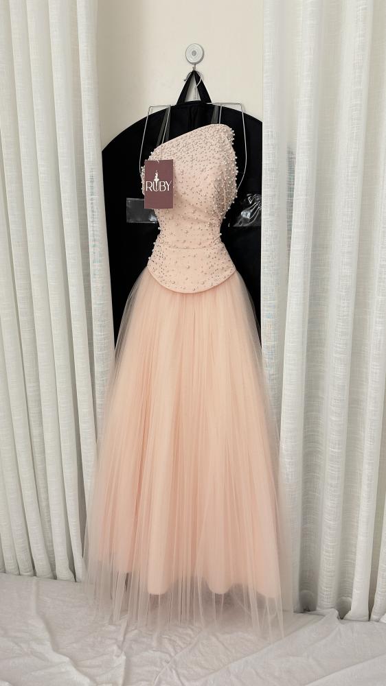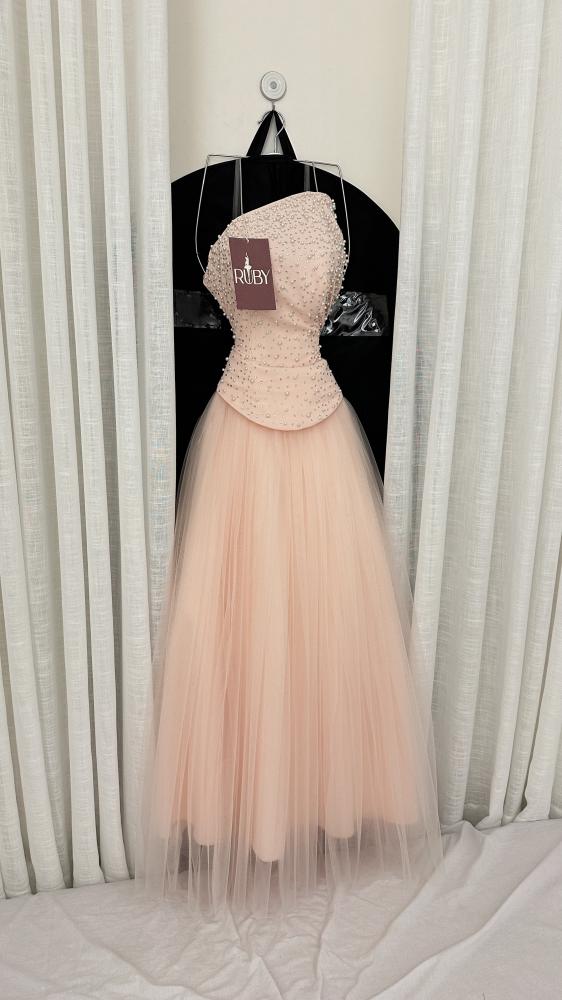 فستان سهرة أو مناسبات بتصميم كتف واحد (One-Shoulder) باللون الوردي الفاتح ، ومزين بالكامل باللؤلؤ أو الخرز اللامع. يتميز الفستان بقصة ضيقة عند الصدر والخصر، مع تفاصيل الخرز التي تغطي الجزء العلوي منه بشكل كثيف. "RUBY".