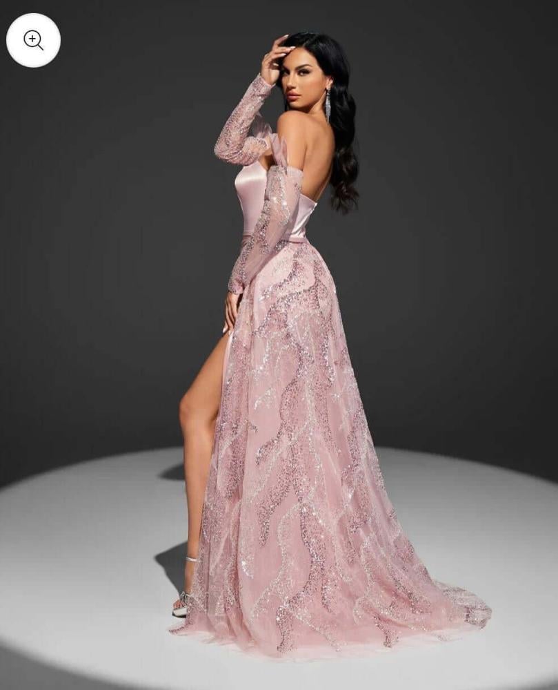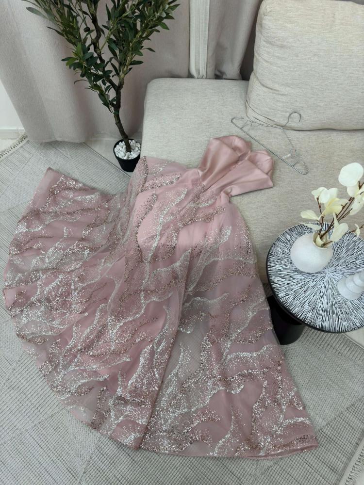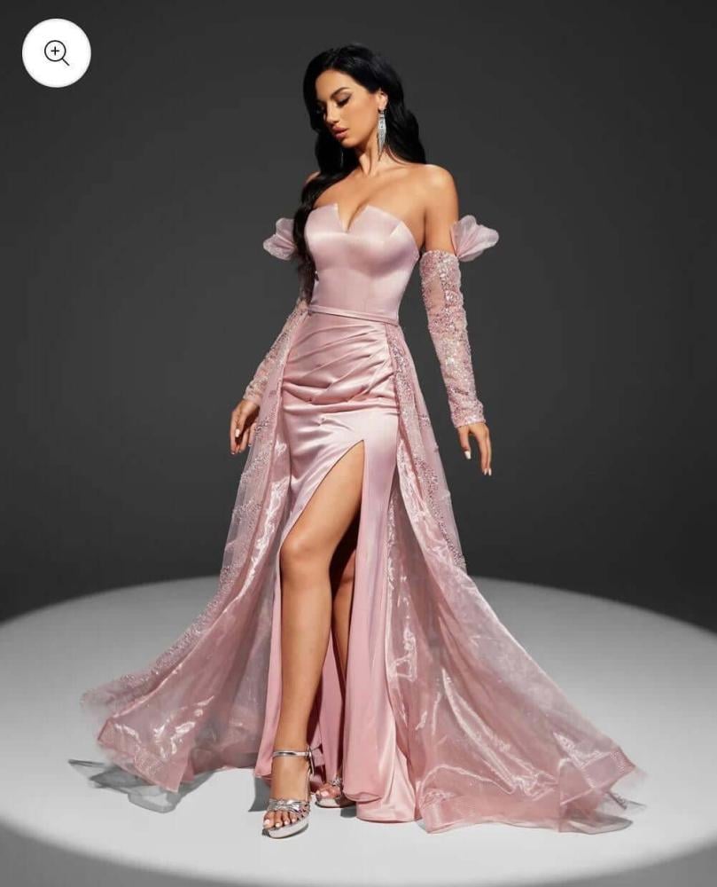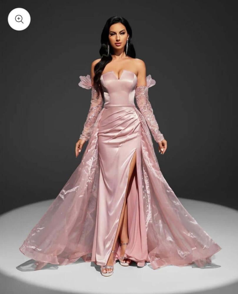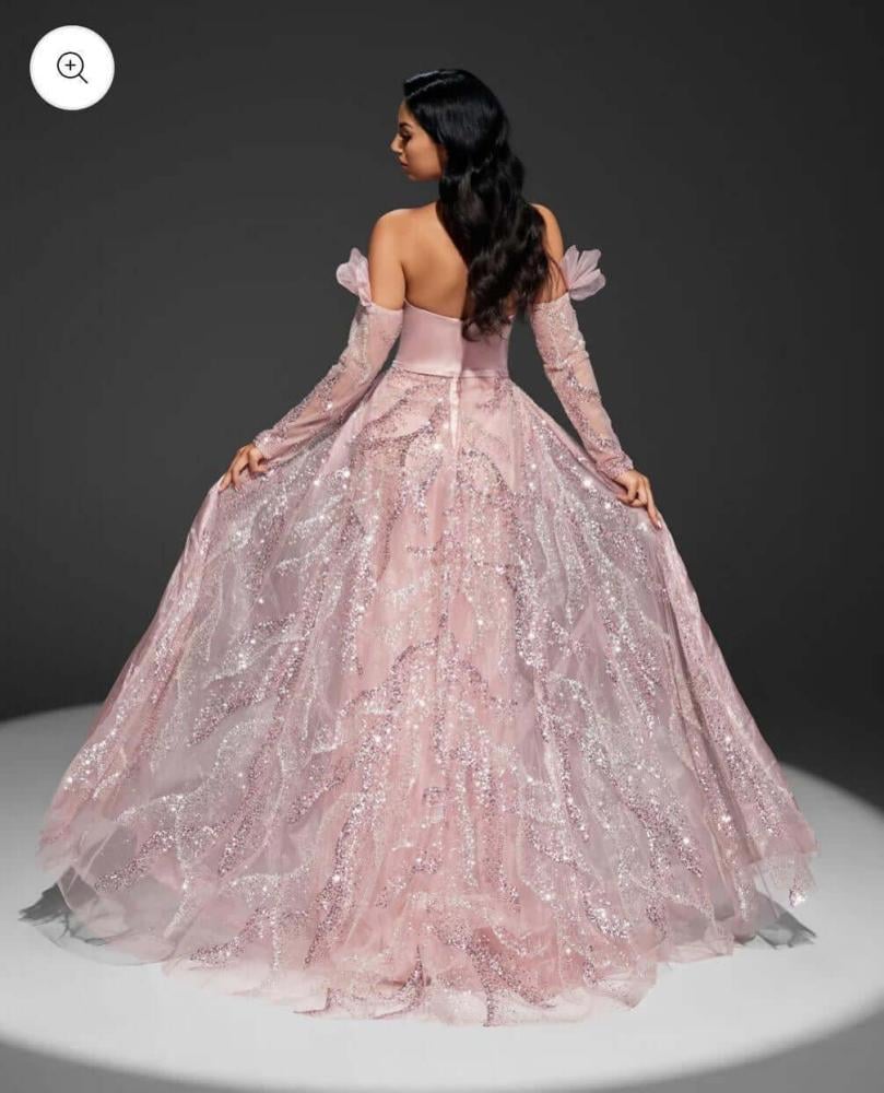 - الأكمام المطرّزة تضيف بريقًا خاصًا، وتجعل الفستان متوازنًا بين الفخامة والنعومة.