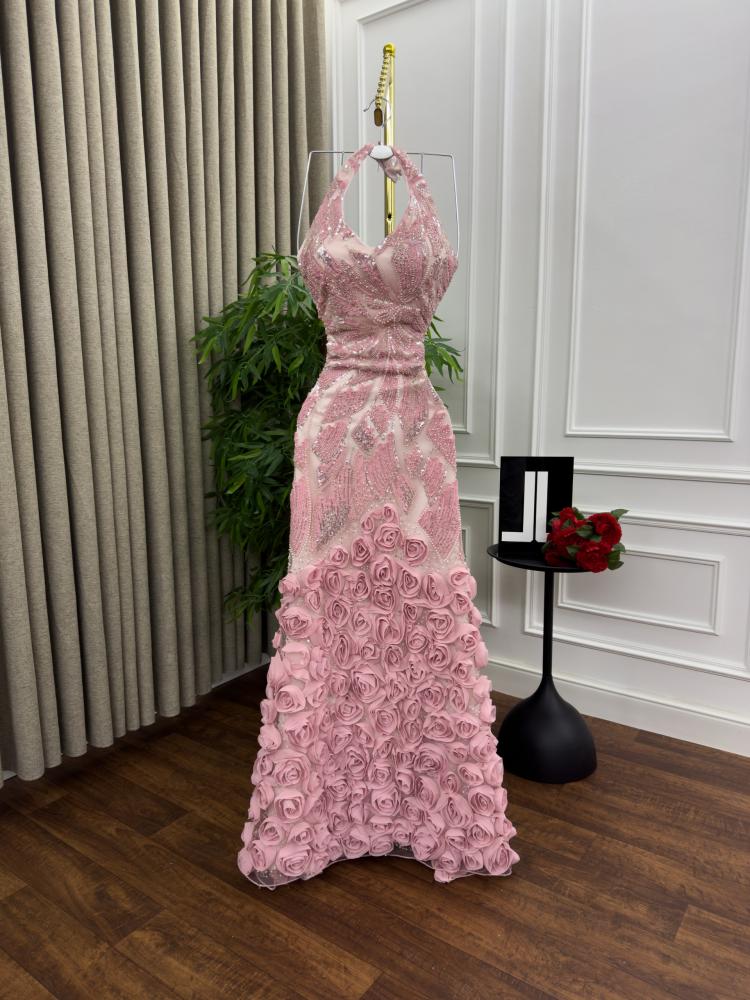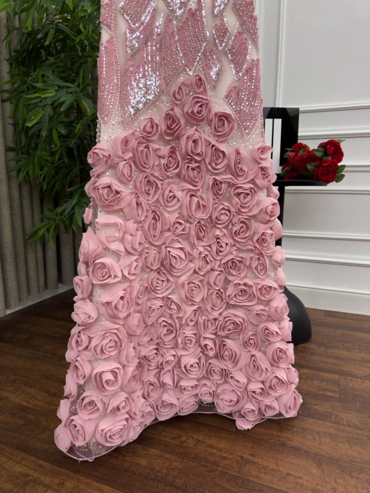 - يتميز الجزء السفلي من الفستان بوجود ورد ثلاثي الأبعاد (3D Roses) كبيرة الحجم، تغطي التنورة بالكامل.
