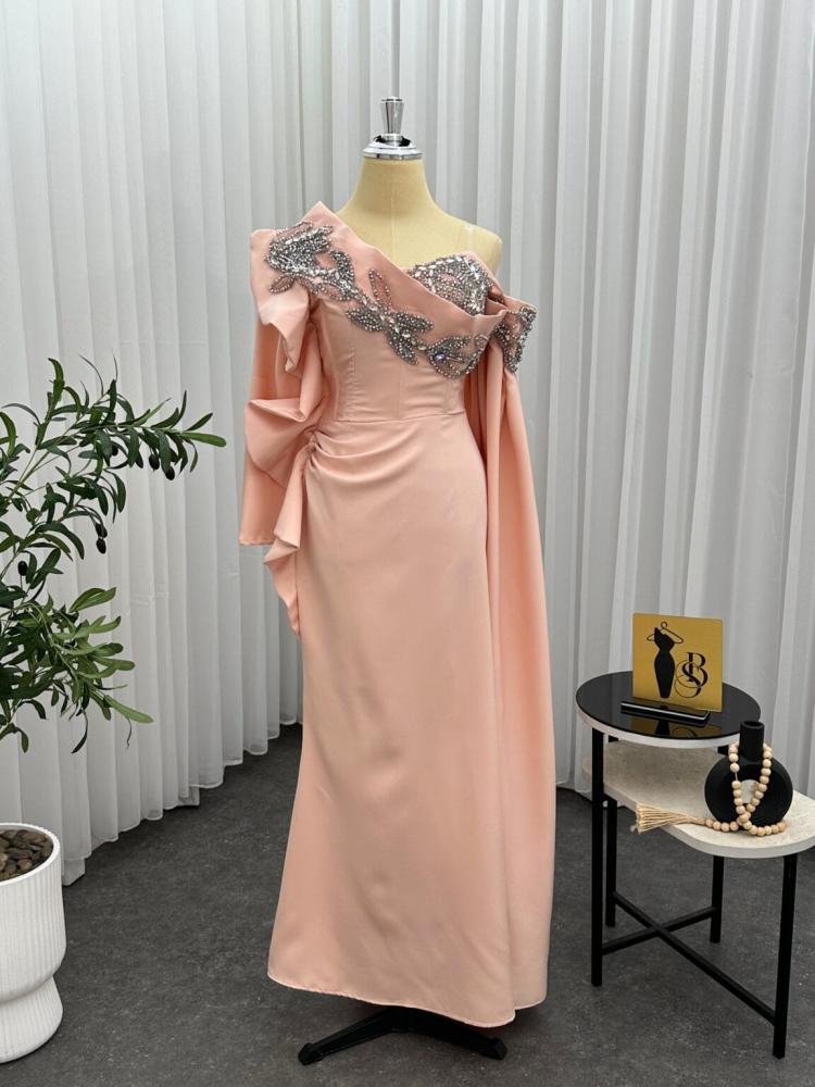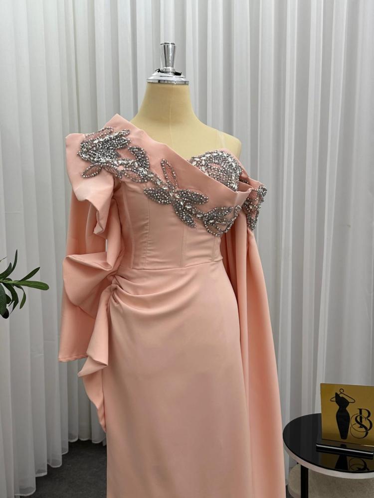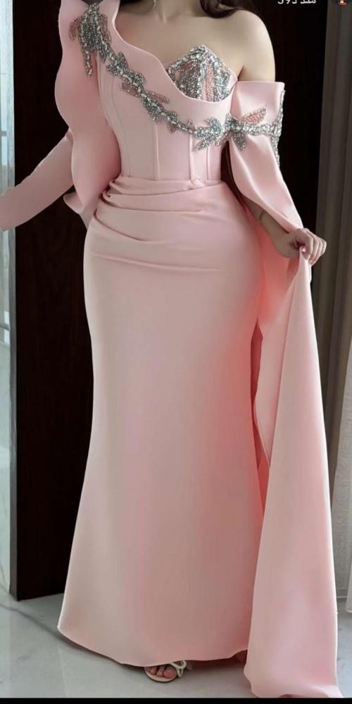 - كم واحد مدمج فقط على الكتف الأيسر، واسع بنهاية ناعمة وطويلة، يعطي حركة درامية فاخرة للفستان، فيما يبقى الكتف الأيمن مكشوفًا بالكامل.