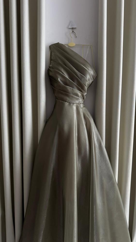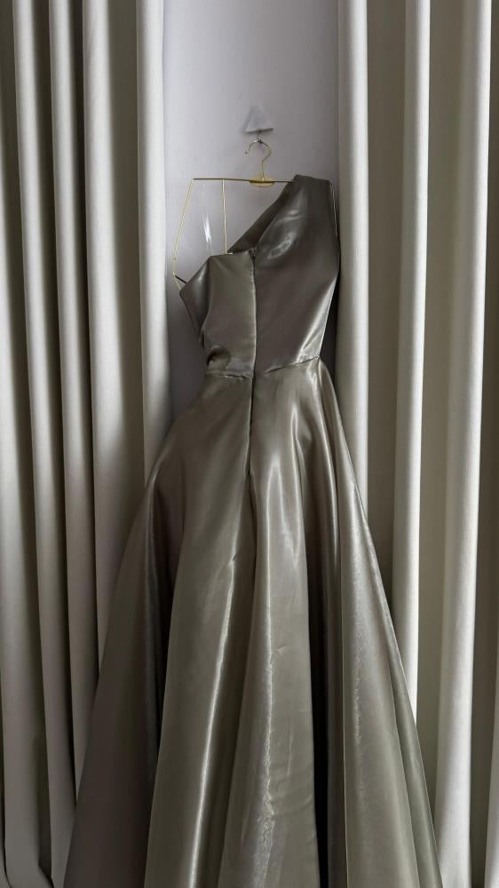 فستان سهرة طويل بلون رمادي فضي، مصنوع من قماش لامع الساتان.