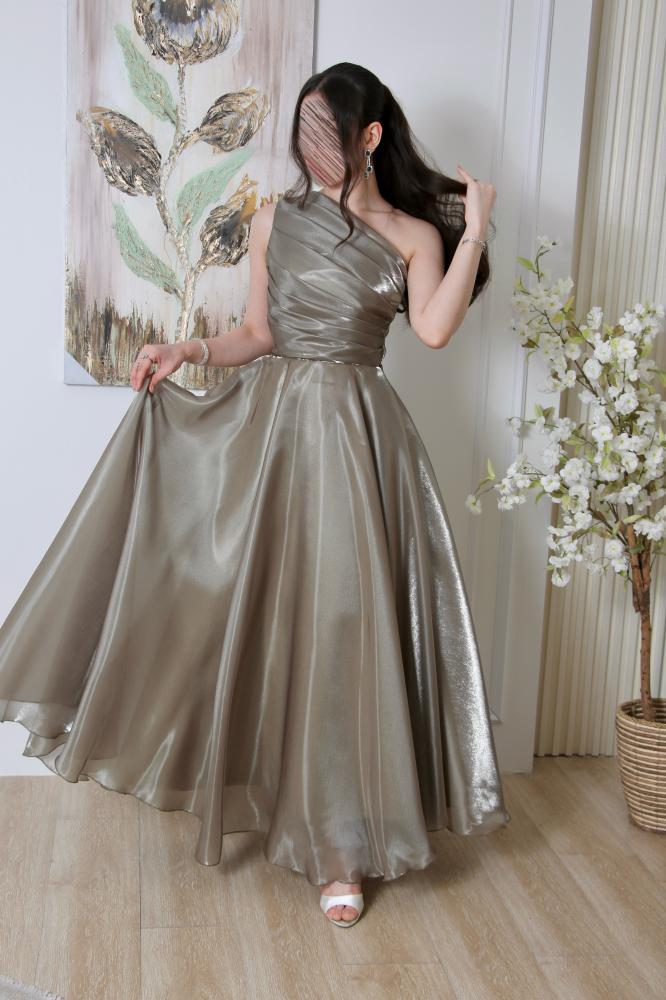 - التصميم: يتميز الفستان بقصة "وان شولدر" (كتف واحد)، حيث يوجد حمالة واحدة على الكتف الأيسر.