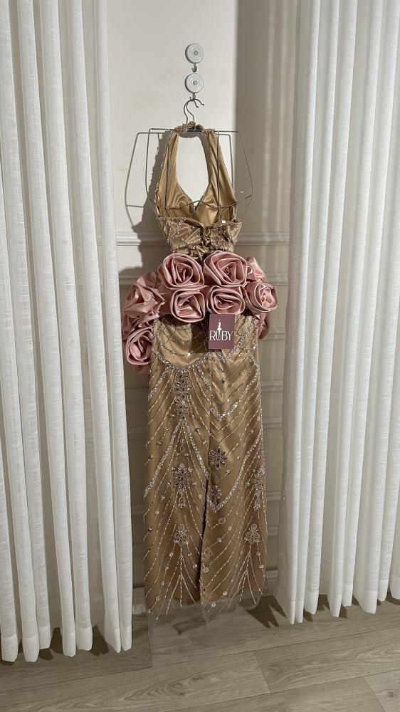 - التصميم العلوي: يتميز الفستان بفتحة صدر عميقة على شكل حرف V مع حمالات رفيعة حول الرقبة (halter neck)، مما يبرز منطقة الصدر والكتفين.