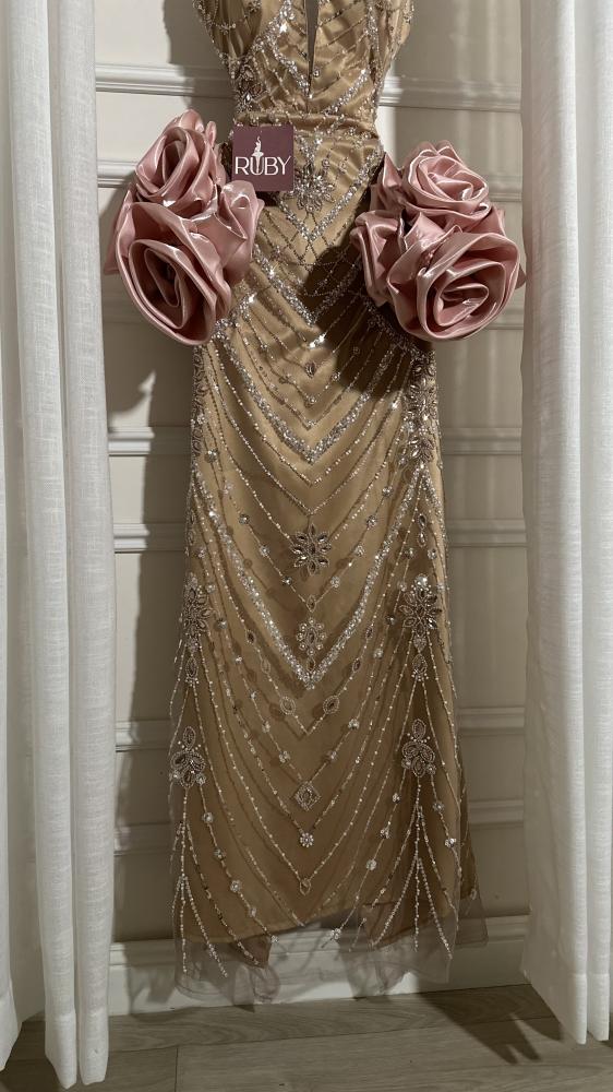 - القصة: يأتي الفستان بقصة ضيقة تبرز تفاصيل الجسم في الجزء العلوي، ثم ينسدل الفستان بشكل انسيابي ليلامس الأرض، مع طبقة داخلية من التل الشفاف لإضافة حجم وحركة.
