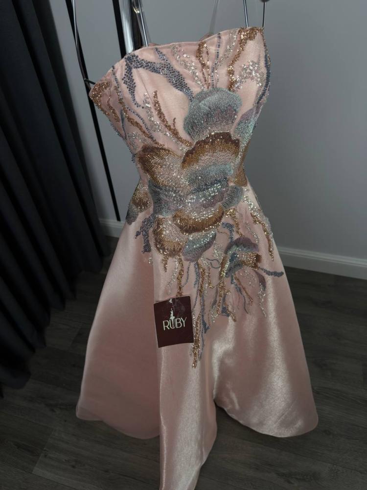 - الطول: الفستان متوسط الطول، حيث يصل إلى ما فوق الركبة بقليل أو منتصف الساق، مما يجعله مناسبًا للمناسبات الرسمية والحفلات.