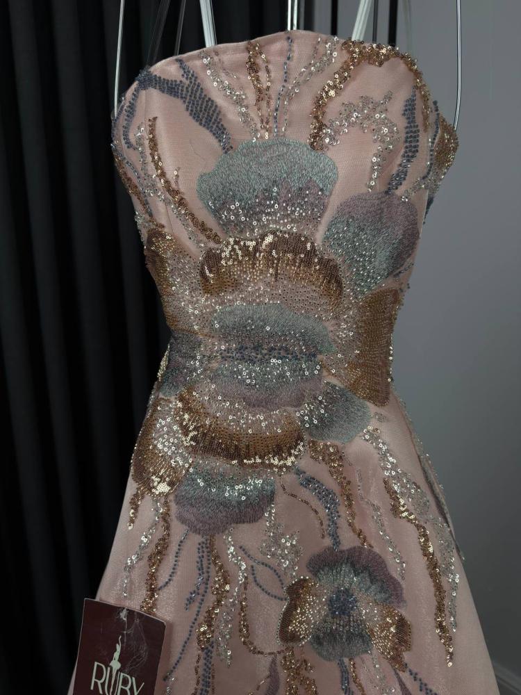 - التصميم: يتميز الفستان بتصميم "سترابلس" أي بدون أكتاف، مع قصة علوية ضيقة تبرز شكل الجسم، وتنسدل منها تنورة واسعة قليلاً.