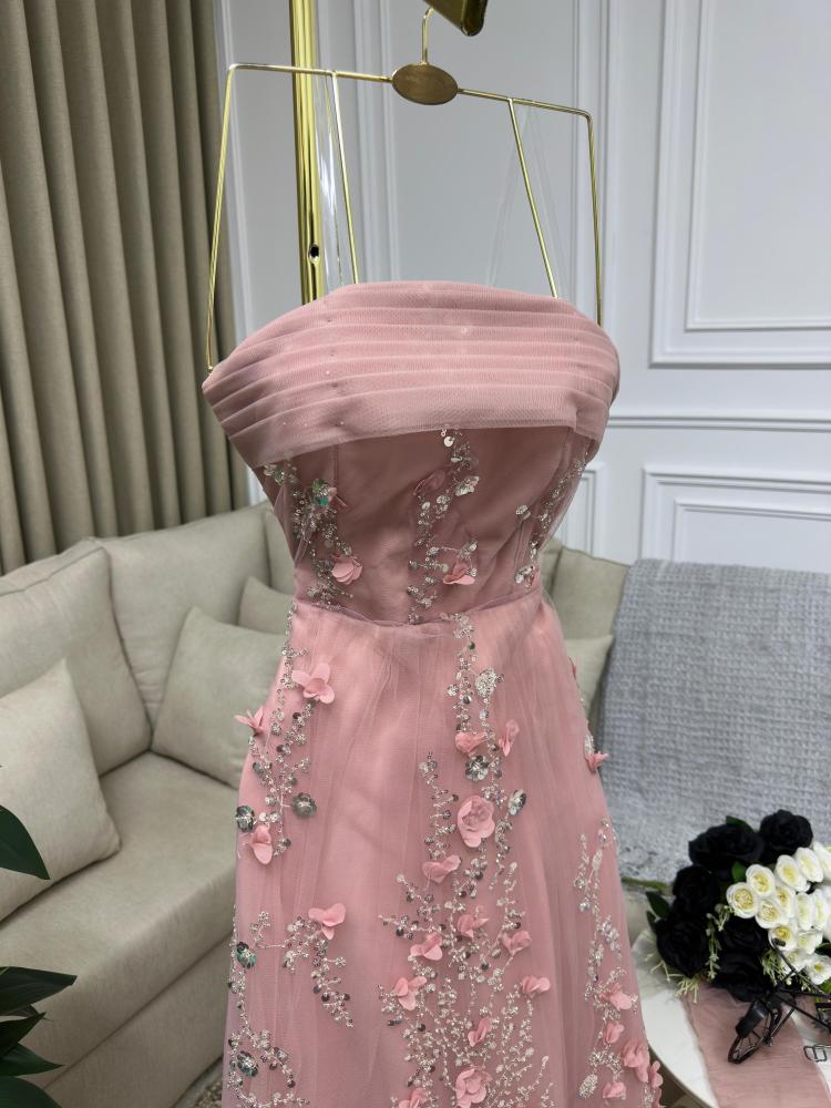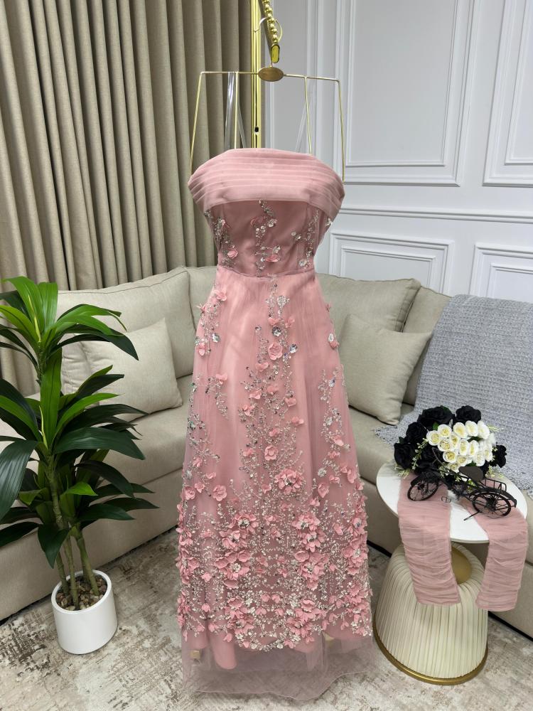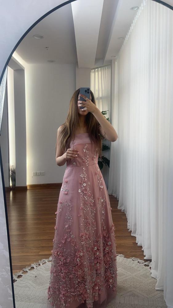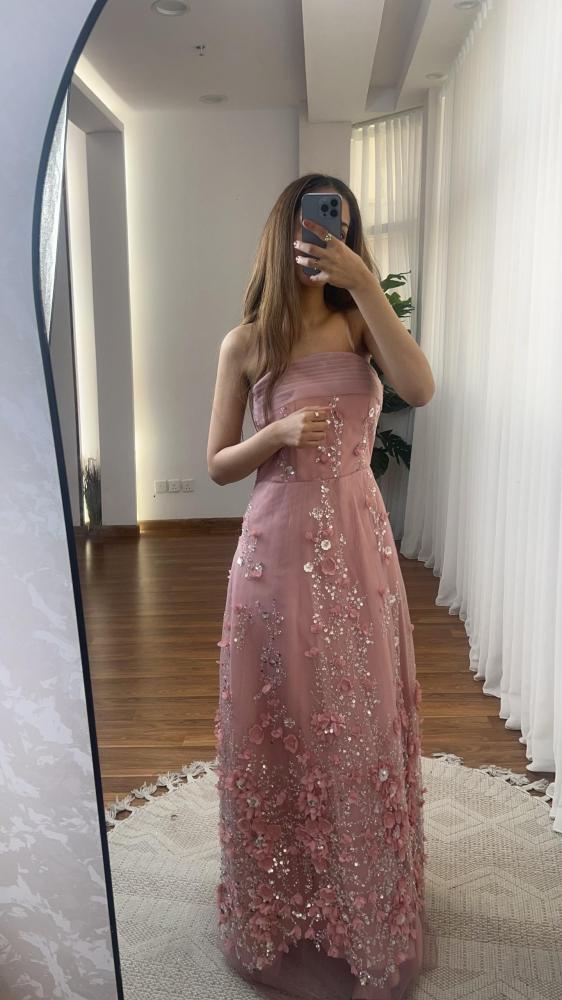 - القصّة: فستان طويل منسدل حتى الأرض، يتميز بقصّة سترابلس (بدون أكمام أو حمالات) تُبرز الأكتاف بشكل أنيق.
