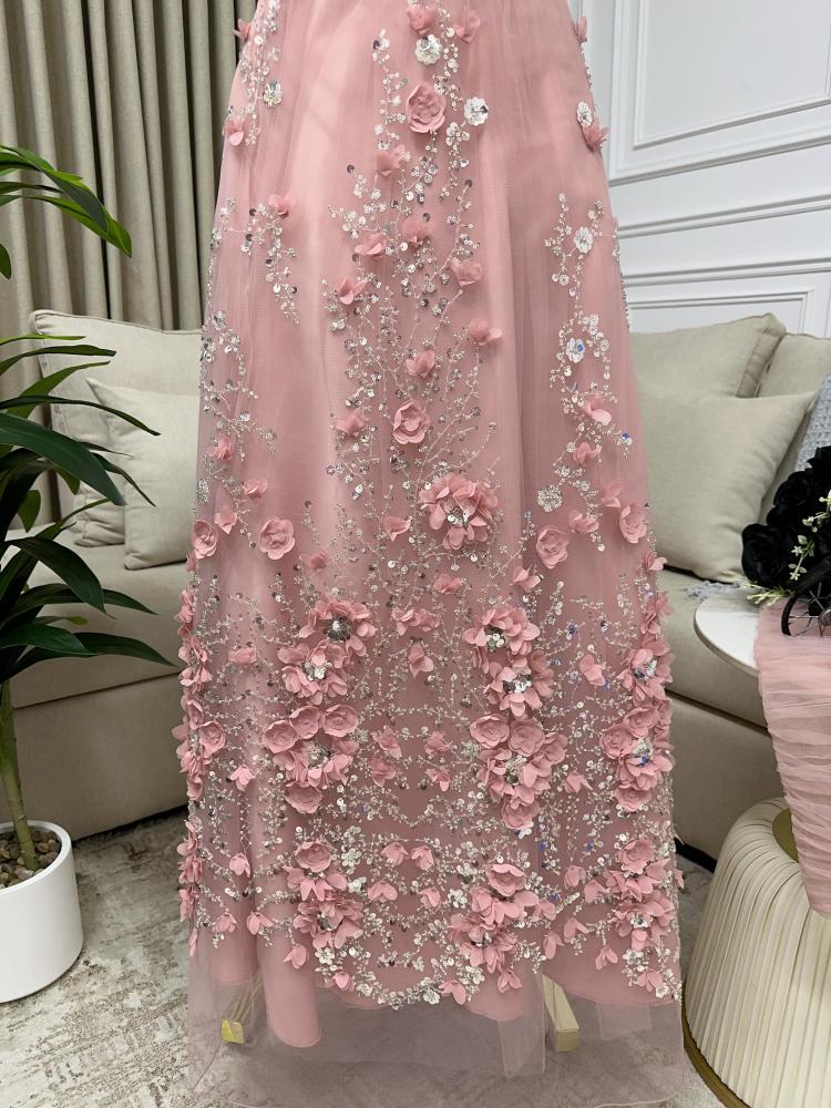 - الطبقة العلوية: مطرزة يدويًا بكثافة بتفاصيل ثلاثية الأبعاد (3D) من الزهور والأحجار الصغيرة اللامعة، خصوصًا في الجزء السفلي من التنورة، مما يمنحه طابعًا راقيًا ومترفًا.
