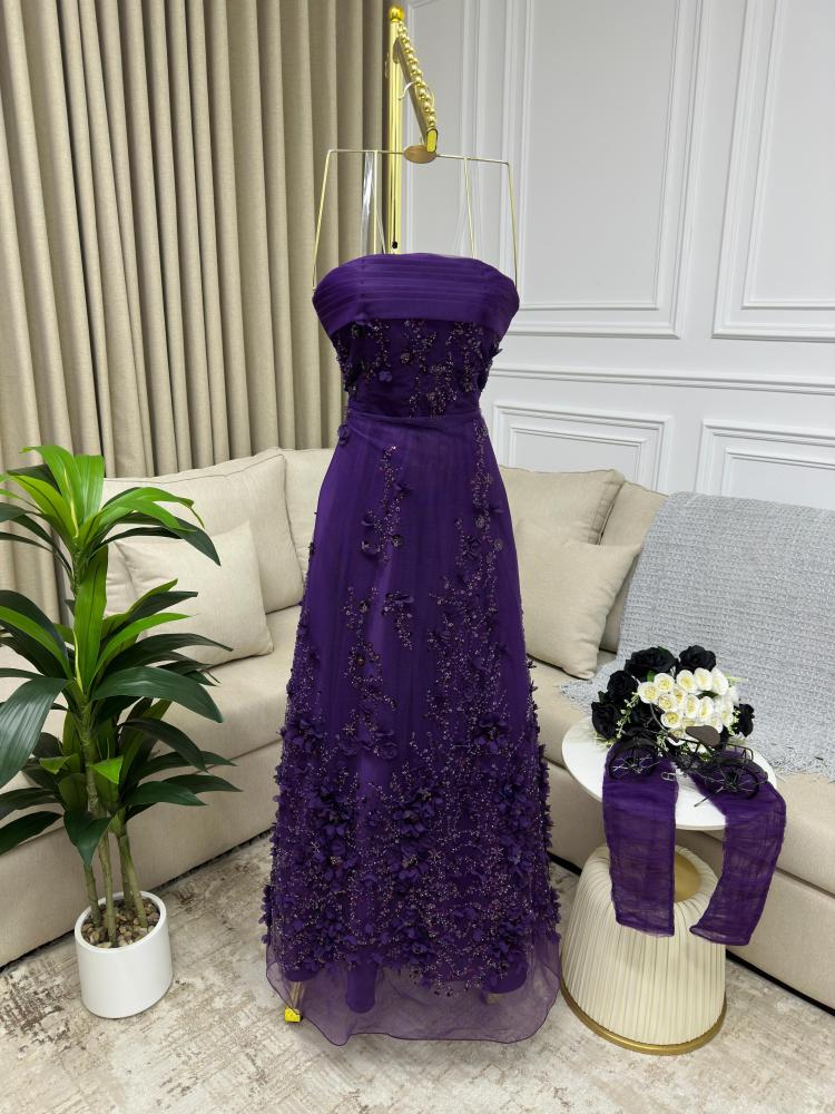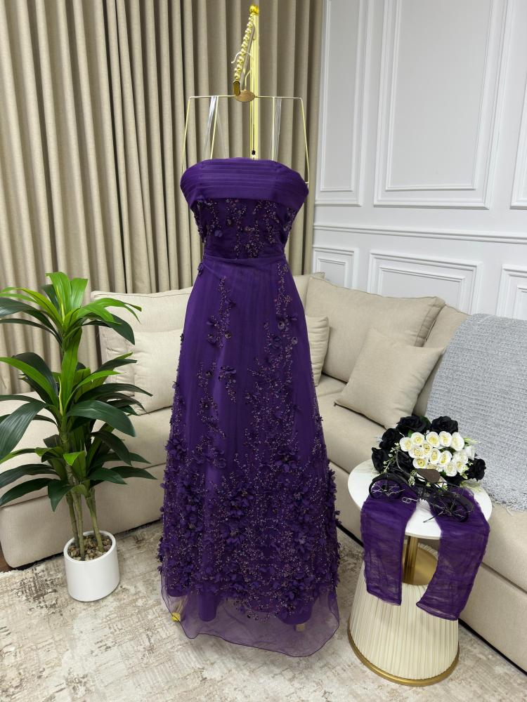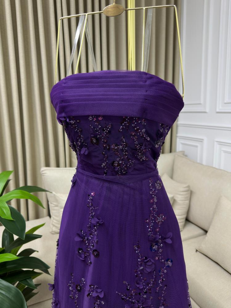 - الزينة تحتوي على زهور صغيرة وتفاصيل خرزية بألوان أرجوانية داكنة متناسقة مع لون الفستان، وتضفي عليه عمقًا وأناقة.