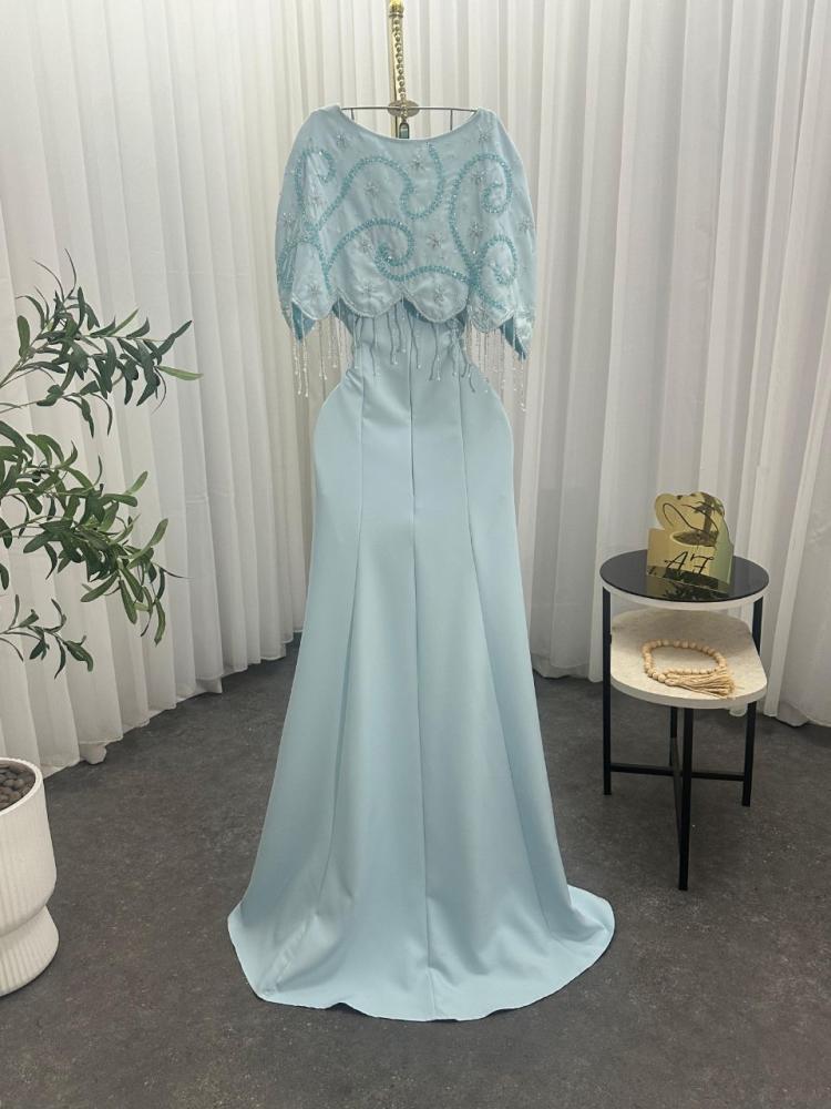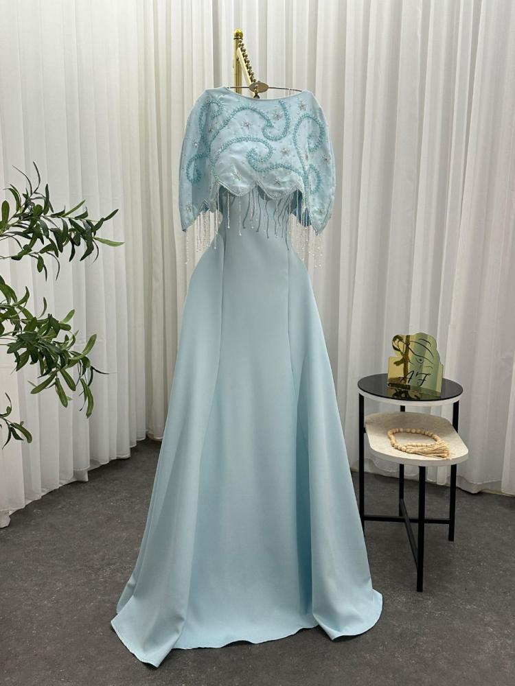• التفاصيل: التطريزات والخرز المتدلي على الكاب يمنح الفستان لمسة من الفخامة والأناقة، مما يجعله مناسبًا للمناسبات الخاصة