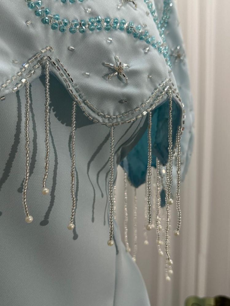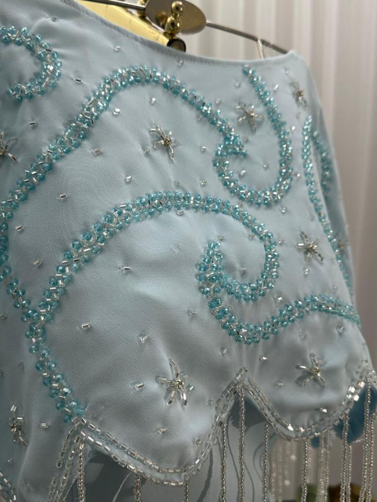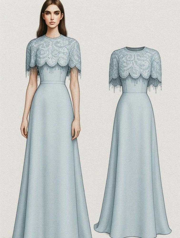 • الجزء العلوي (الكاب): يتزين الفستان بقطعة كاب علوية مطرزة بالفصوص والخرز، مع خيوط متدلية من الخرز تضفي إحساسًا بالحركة والتميز.