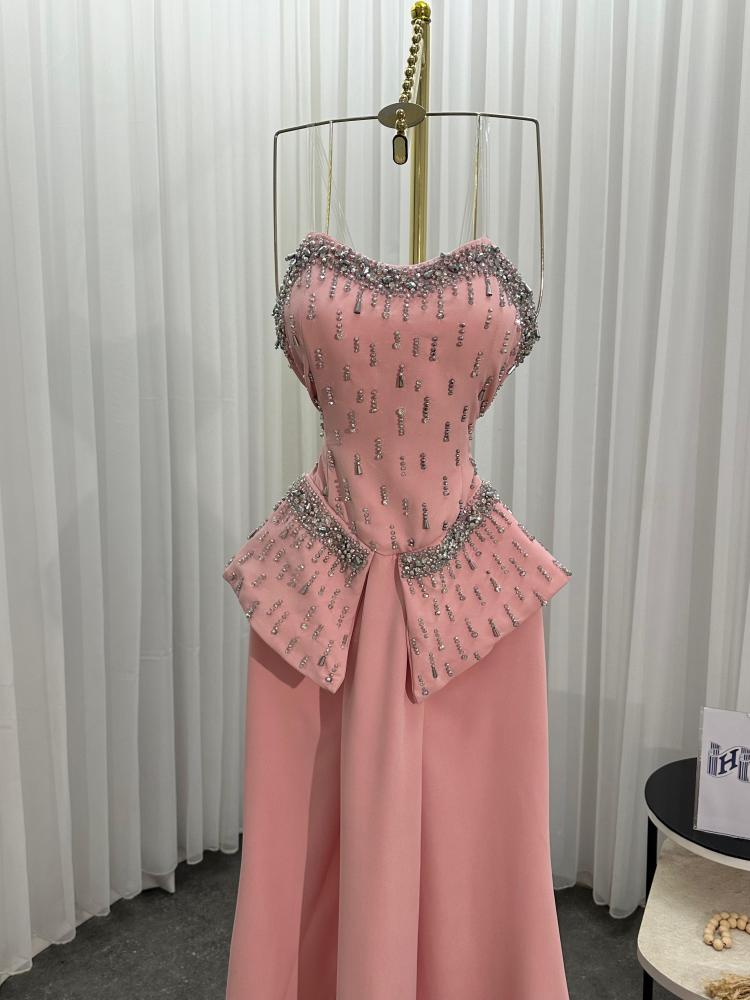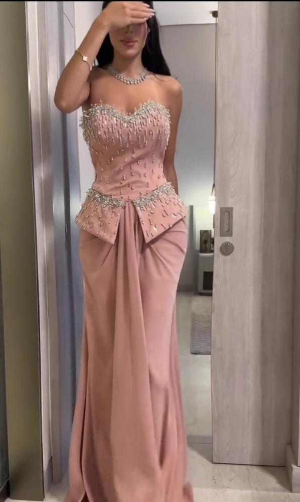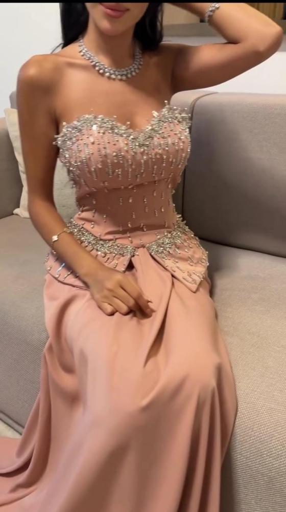 - الفستان بلون وردي فاتح أو "بيج وردي"، ويظهر مصنوعًا من قماش ناعم ولامع، ربما الساتان أو الحرير الصناعي، مع جزء علوي مطرز.