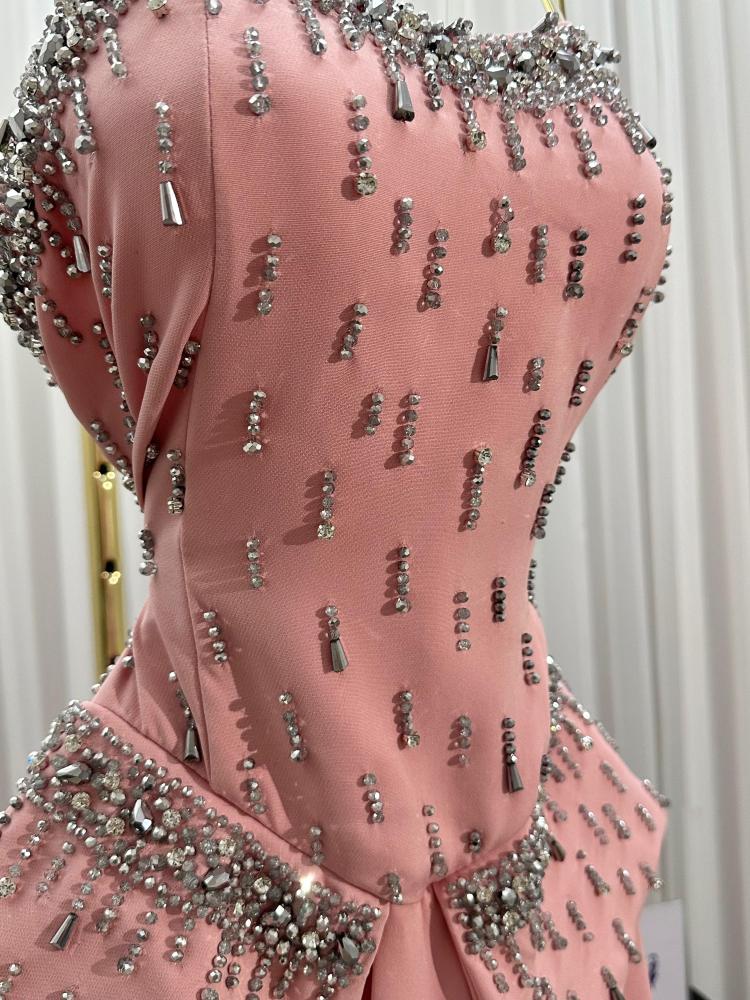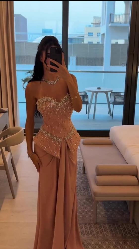 - الجزء العلوي من الفستان مصمم على شكل "كورسيه" أو "صدرية" بدون حمالات، مزين بتطريزات كثيفة من الخرز اللامع أو الكريستال على طول الحافة العلوية وعلى الصدر، مما يضيف لمسة من البريق.