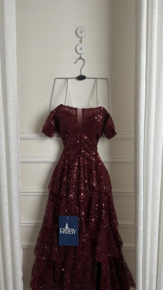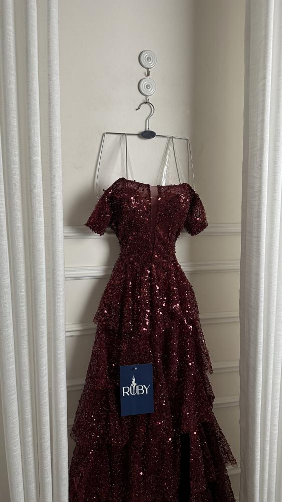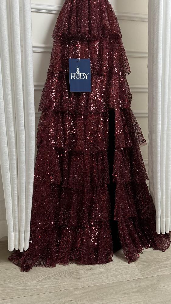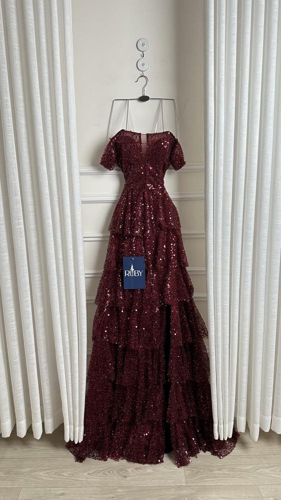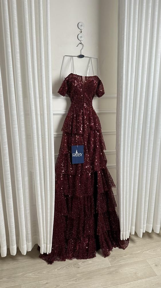 - التنورة: تأتي بتصميم طبقات متدرجة (Tiered skirt) تضفي حجمًا وجمالية على الفستان، وتنسدل بطول كامل حتى الأرض.