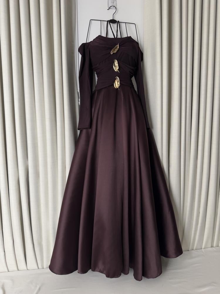 - اللون والخامة: الفستان الأرجواني الغامق، مصنوع من خامة ذات مظهر لامع وناعم، .