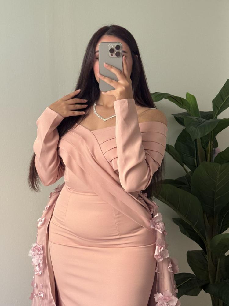 اللون: لحمي التصميم: يتميز الفستان بقصة ضيقة على الجسم، مع ياقة مكشوفة الكتفين.الأكمام: الأكمام طويلة ومزينة بطيات أفقية عند الأكتاف.الخصر: يتميز بوجود طيات درابيه ملتفة حول الخصر.