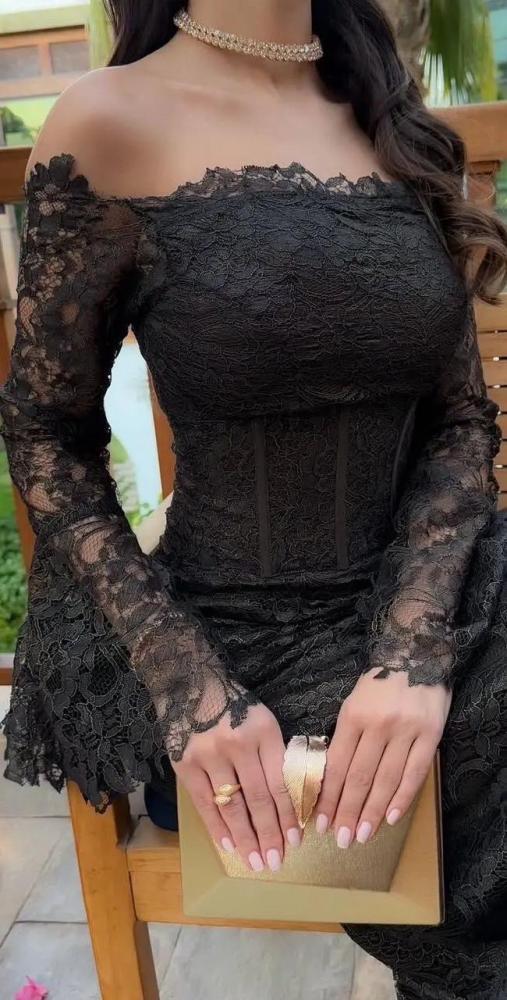 - الأكمام: طويلة وشفافة، مصنوعة من نفس قماش الدانتيل، وتتميز بشكل ضيق عند الأذرع.