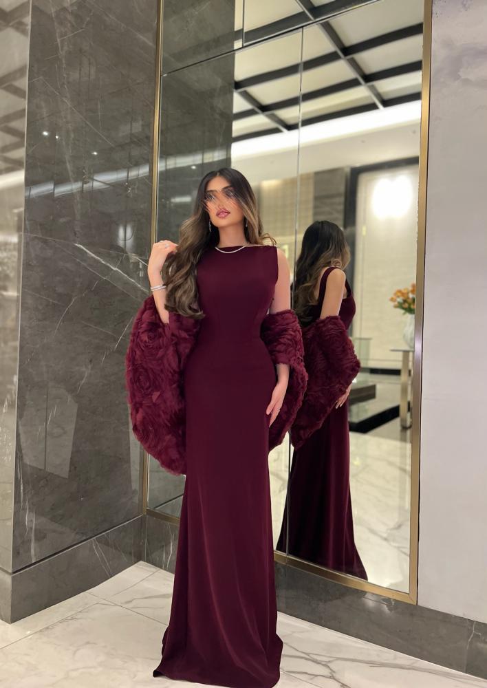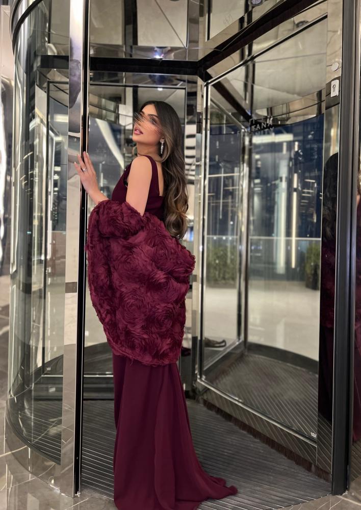 - شال/معطف فرو بلون مطابق: مضاف كقطعة فخمة حول الذراعين والكتفين، من الفرو العنابي الغامق، مما يعزز مظهر الفخامة والدفء.