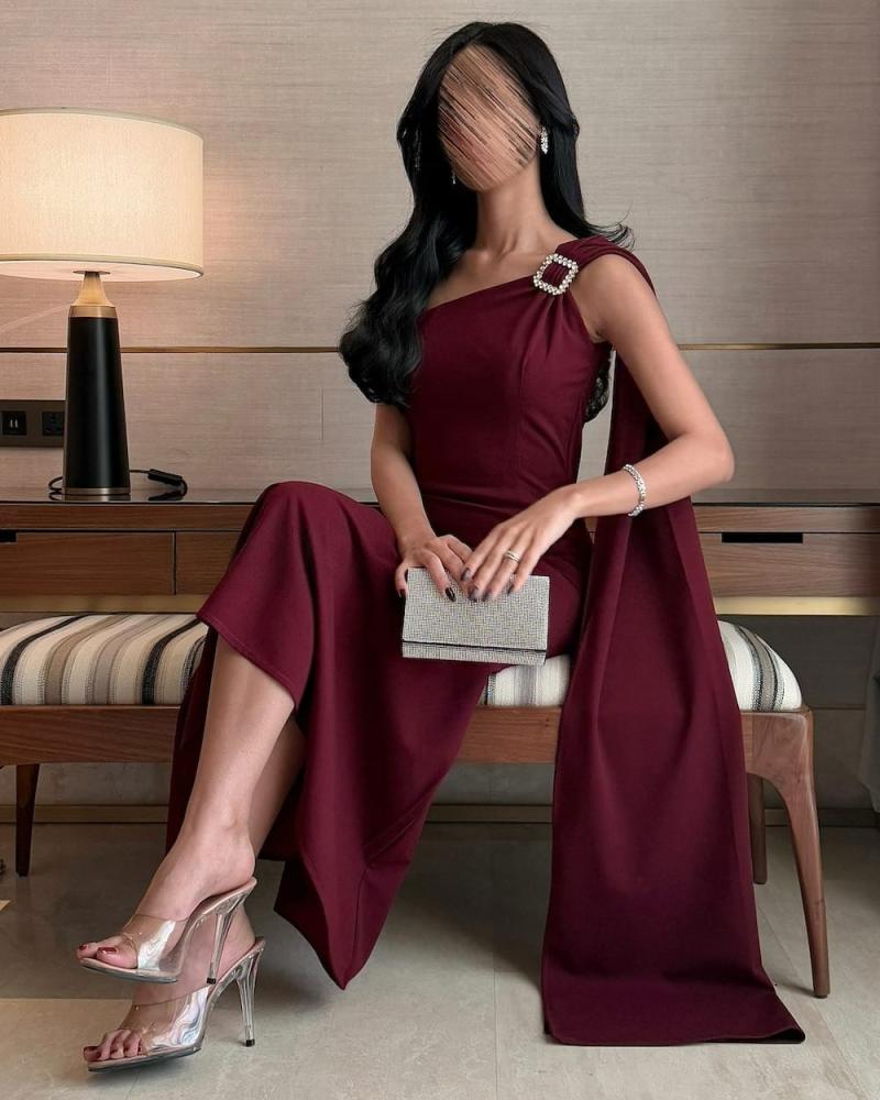 - الكتف: يتميز الفستان بتصميم كتف واحد (One Shoulder) مما يضفي عليه طابعًا عصريًا وراقيًا.