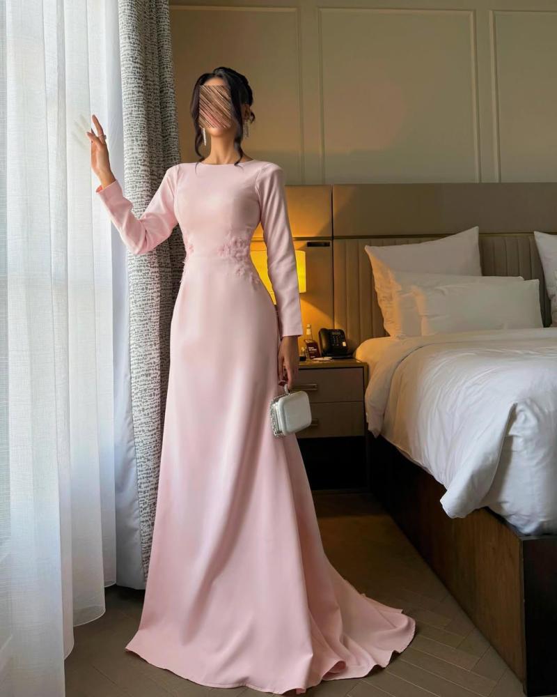 - طويل يصل إلى الأرض مع ذيل خفيف من الخلف يمنح الفستان فخامة إضافية.