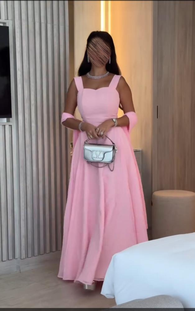 - تم تنسيق الفستان مع شال شفاف بنفس اللون الوردي، يُلف حول الذراعين.