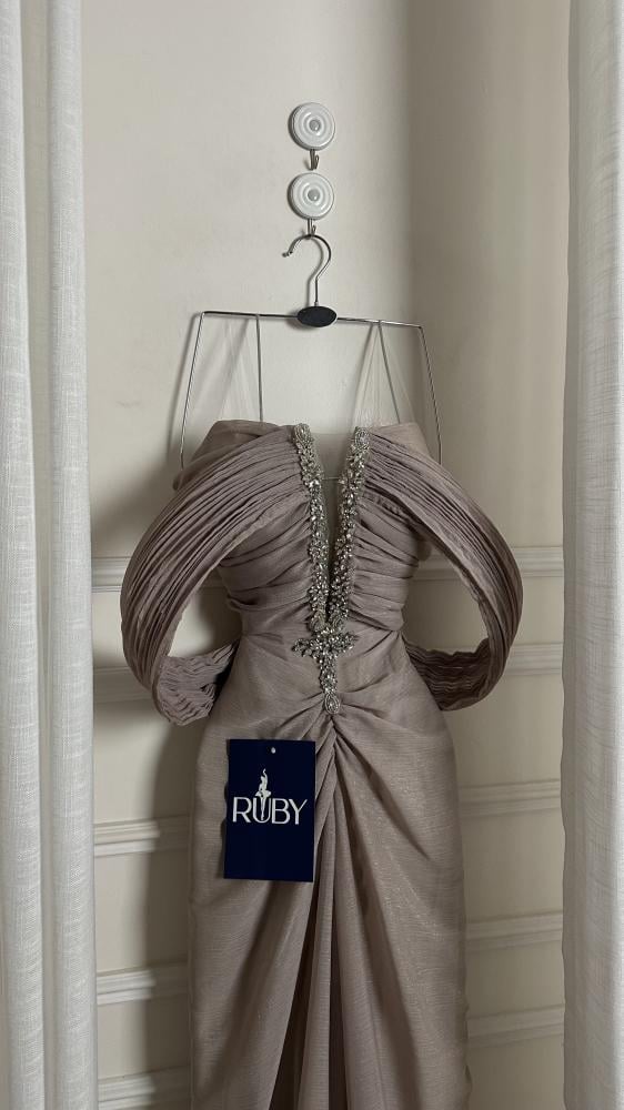 - الصدر: الصدر مزين بتكسيرات دقيقة (بليسيه) مع تطريز مركزي من الكريستال أو الخرز اللامع يمتد عمودياً.