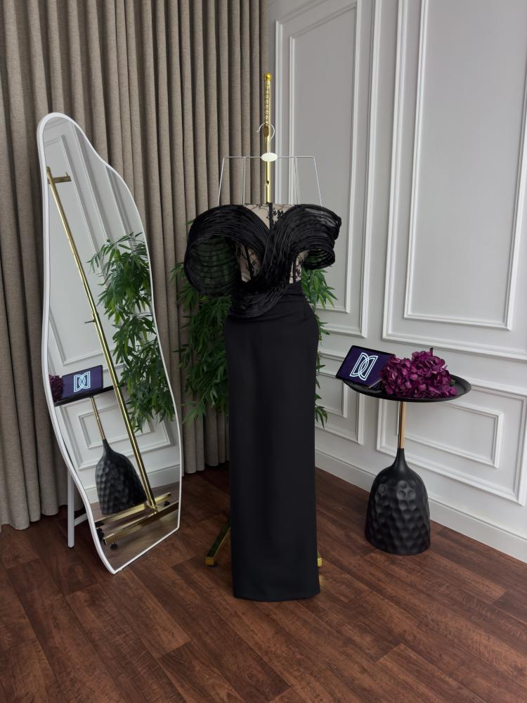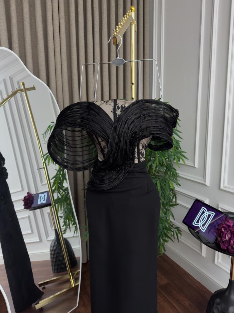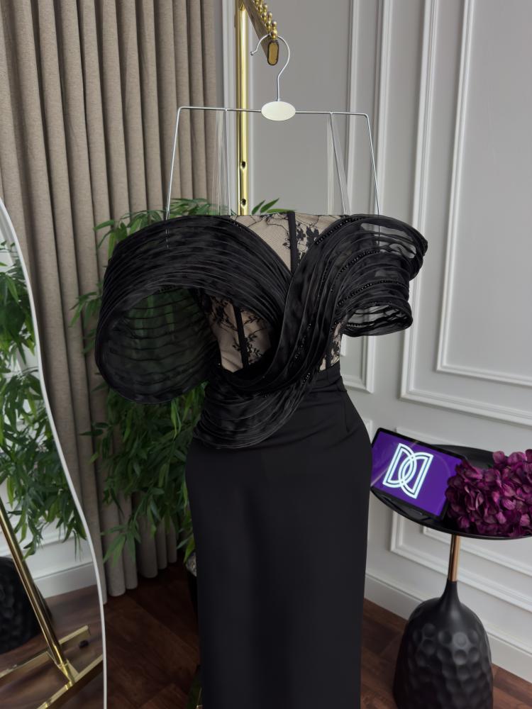 • لجزء العلوي: يتميز الفستان بياقة مفتوحة وتصميم علوي يشبه الكورسيه، مع قماش شفاف من الدانتيل الفاخر وتطريزات سوداء. يبرز الجزء العلوي تصميم الأشرطة المتعددة على الكتفين، مع قماش أسود مطوي ومنسدل يضيف لمسة درامية وجاذبية خاصة.