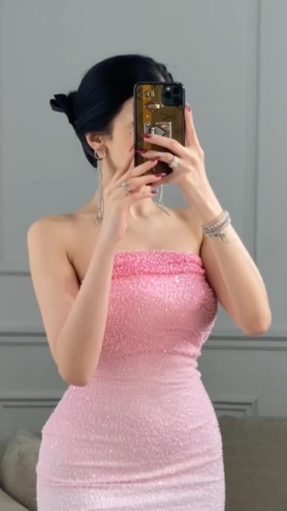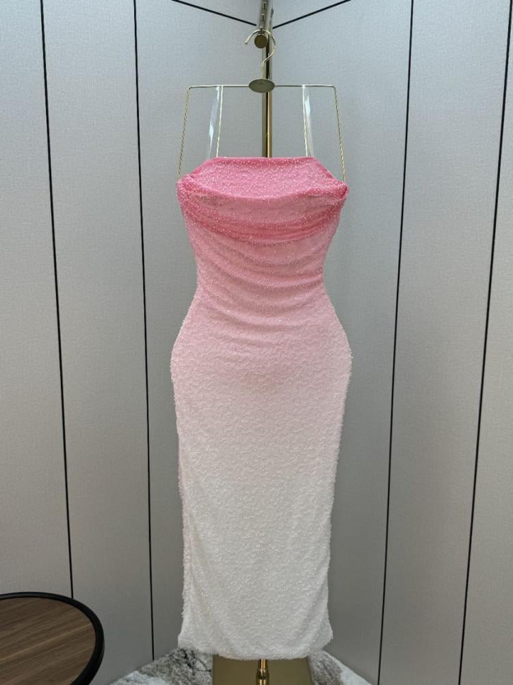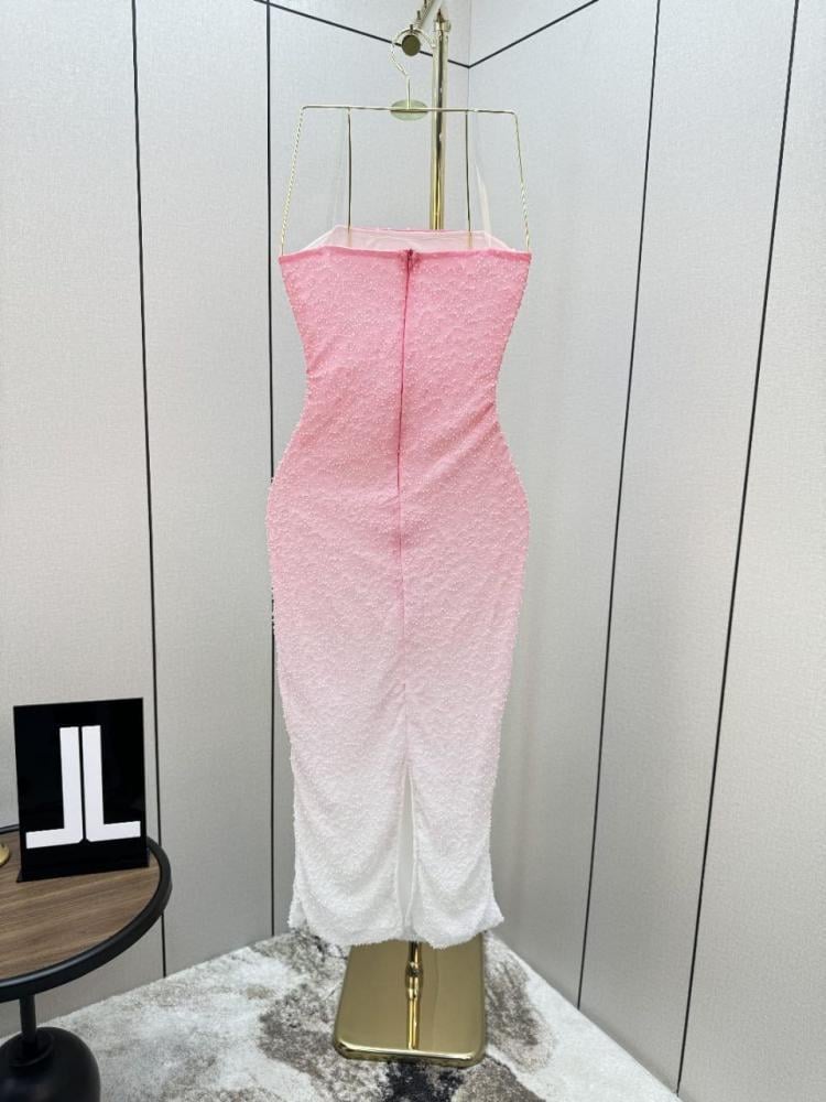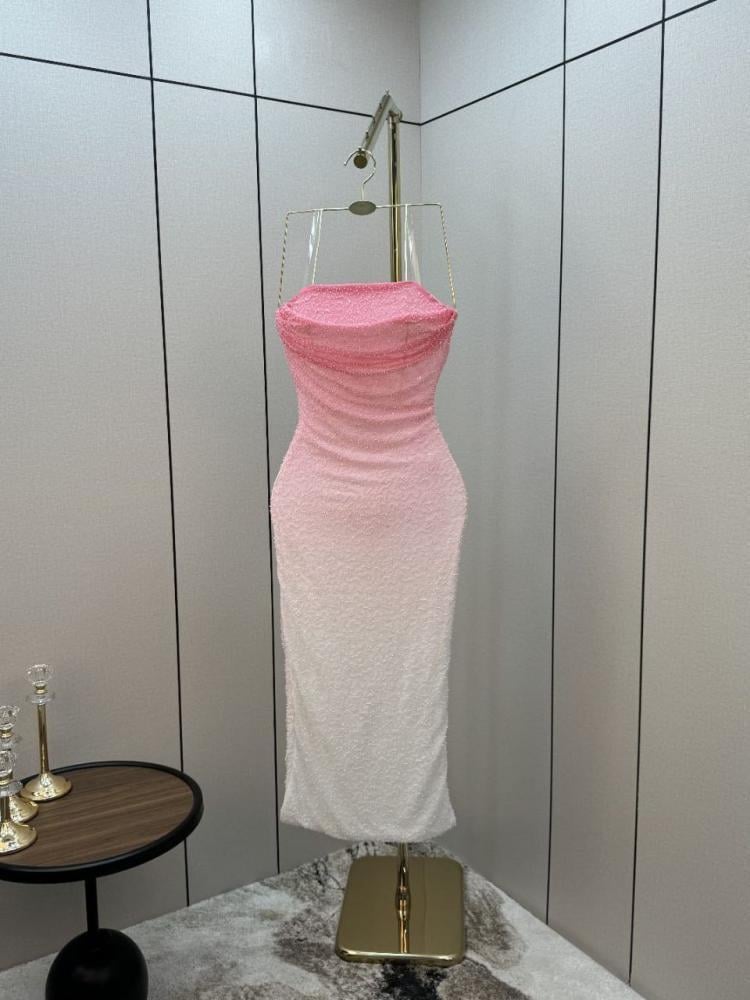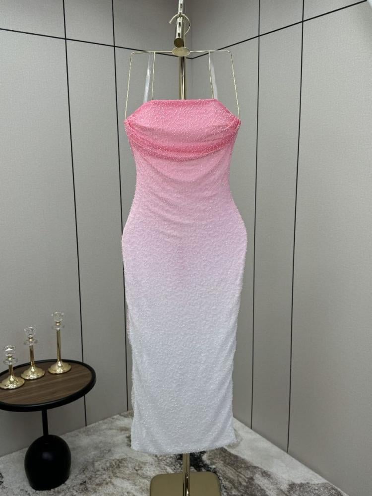 التصميم: الفستان ضيق (Bodycon) وبدون حمالات، ويصل طوله إلى منتصف الساق.الخامة: مصنوع من قماش مزين بالخرز و الترتر اللامع الذي يغطي الفستان بالكامل.اللون: يتميز بتدرج لوني جذاب، حيث يبدأ باللون الوردي في الجزء العلوي